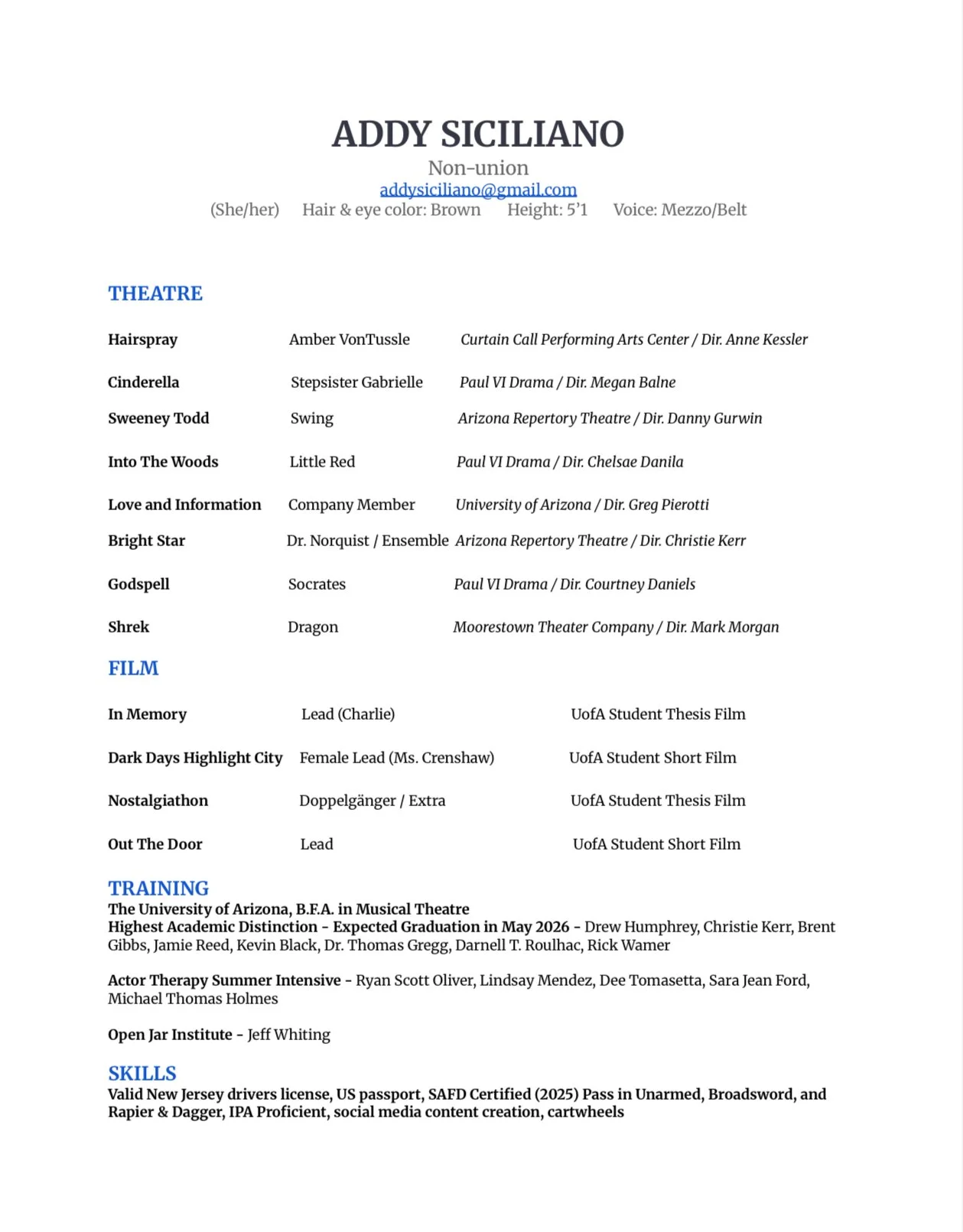 Hey there! I’m Addy — a singer/actor from New Jersey currently pursuing my BFA in Musical Theatre at the University of Arizona with a minor in Retailing and Consumer Science. When I’m not performing, you can probably find me doing pilates, watching the Philadelphia Eagles, trying a new coffee shop, or spending my summers at the Jersey shore soaking up the sun. I’m passionate about storytelling, connection, and bringing honesty to every role I take on, whether on stage or screen.